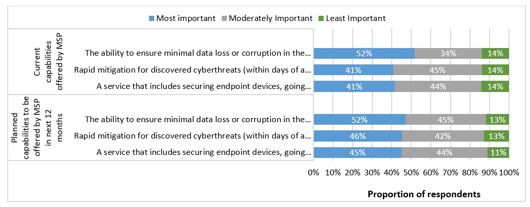 La sección de la encuesta que se centró en la seguridad fue fundamentalmente explorar qué capacidades ofrecen actualmente los servicios de seguridad administrados que los MSP ofrecen o planean ofrecer en los próximos 12 meses. Había más de una docena de capacidades entre las que los MSP podían elegir, y el siguiente gráfico muestra las tres respuestas principales, que incluyen minimizar la pérdida de datos, la mitigación rápida y asegurar puntos finales más allá del antivirus y el anti-ransomware.