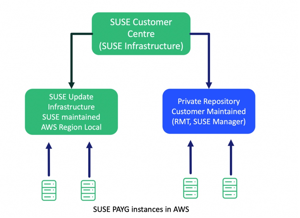 Vale la pena señalar que ambas soluciones se conectan directamente al Centro de Clientes de SUSE; existen tres requisitos previos clave para que los clientes de PAYG puedan conectar un repositorio privado al SCC.