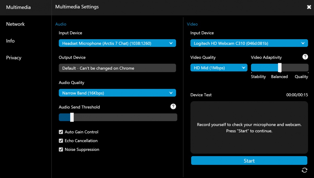 Un factor importante que puede hacer o deshacer su experiencia WebMeeting es su propio ancho de banda de Internet. Para permitir que WebMeeting utilice su conexión a Internet a su máxima capacidad, use la configuración "Adaptabilidad de video".