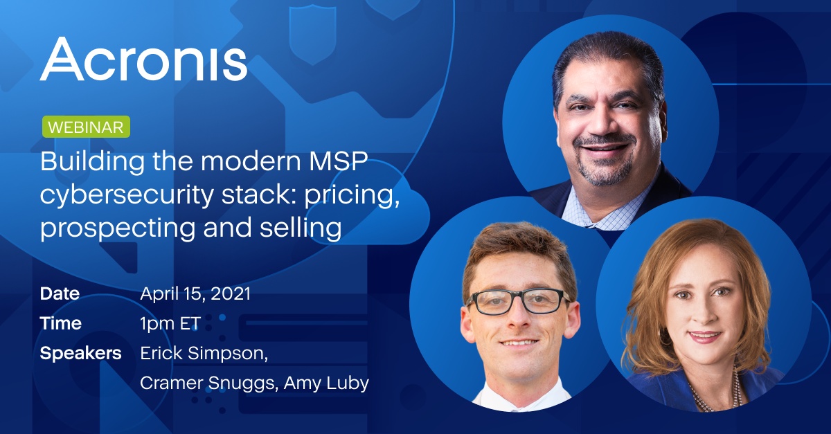 Los MSP que busquen respuestas prácticas a estas preguntas las encontrarán en el próximo evento de Acronis, Construyendo la pila de ciberseguridad MSP moderna: precios, prospección y venta . Este evento virtual, que tendrá lugar el 15 de abril de 2021 a la 1 pm EDT, presenta a dos asesores de canal veteranos y emprendedores exitosos: Erick Simpson y Amy Luby de Acronis.
