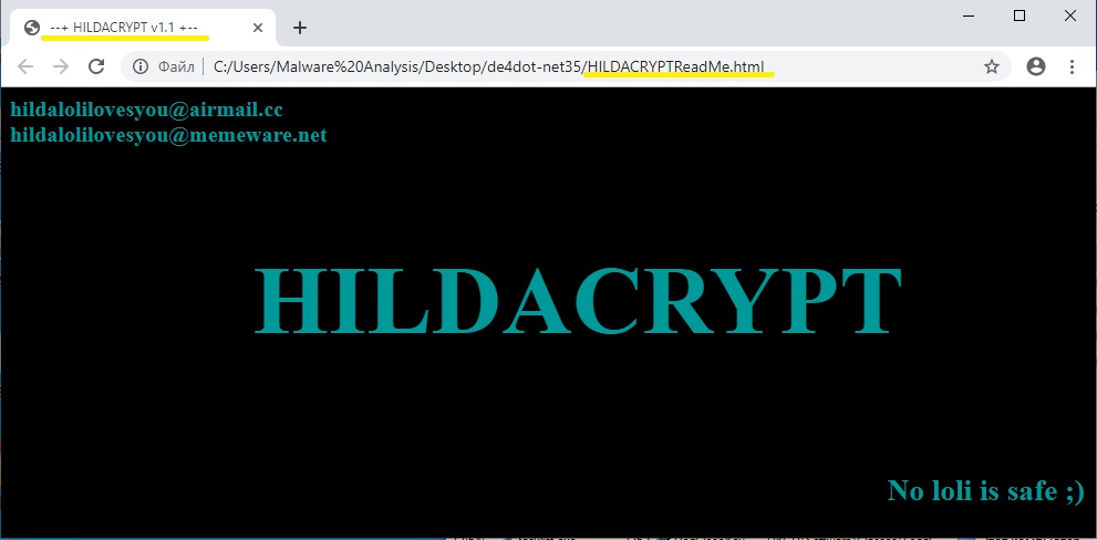 HILDACRYPT es una nueva familia de ransomware, hay una versión aún más nueva. El modelo de cifrado no permite a las víctimas descifrar archivos cifrados por el ransomware. El cryptolocker emplea técnicas de protección activa para cerrar los servicios de protección que pertenecen a soluciones de respaldo y antivirus. El autor de HILDACRYPT es claramente un fanático del anime y de la serie de televisión "Hilda" en Netflix.