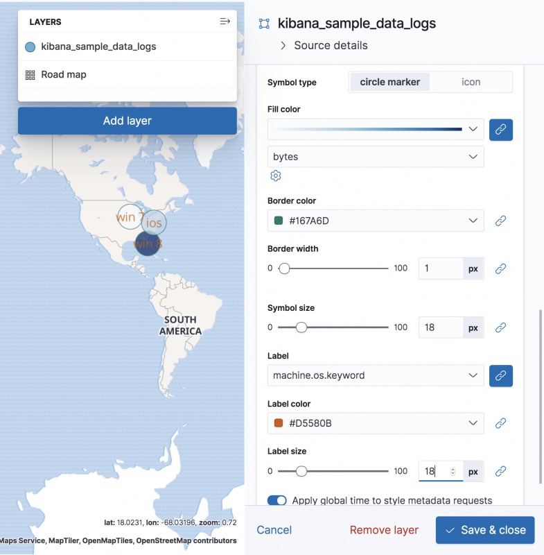 La versión 7.6 Elastic Maps brindará a los usuarios la capacidad de mostrar una etiqueta para las características de Point. Es algo que los clientes han pedido que realicen, ya que es parte de lo que cualquiera que vea los mapas esperaría tener: el texto del valor de la característica es visible en el mapa.