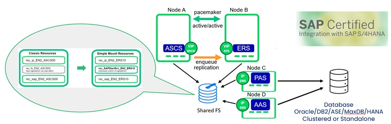 SUSE ha lanzado una arquitectura diferente, especialmente útil en el entorno de la nube, donde NFS se usa comúnmente para los sistemas de archivos compartidos. El clúster ya no administra los sistemas de archivos compartidos. En cambio, se montan en el inicio del sistema operativo. SUSE creó un agente de recursos " SAPStartSrv ", sí, el mismo nombre que el marco SAPStartSrv, porque el trabajo del agente de recursos es administrar el servicio SAPStartSrv de ASCS y ERS, respectivamente, por lo que solo se inicia en el nodo correspondiente. Esta solución está soportada en SLES para Aplicaciones SAP 15, ya certificada por la certificación SAP HA-Interface . Azure es la primera nube que adoptó esta solución, ahora la predeterminada para cualquier implementación nueva. La guía de configuración de Azure “SAP NetWeaver de alta disponibilidad con montaje simple y NFS en SLES para máquinas virtuales de aplicaciones SAP” se puede encontrar aquí .