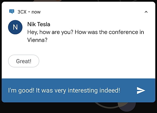 Con la nueva aplicación, sus notificaciones de chat 3CX son interactivas. Responda rápidamente directamente desde la notificación de chat, sin cambiar a la aplicación principal.