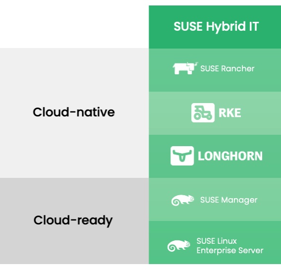Tras la adquisición de Rancher Labs en diciembre de 2020, SUSE puede ofrecer las mejores tecnologías para cada capa de la pila de TI híbrida. SUSE Hybrid IT admite dos tipos de aplicaciones empresariales: nativas de la nube y listas para la nube: