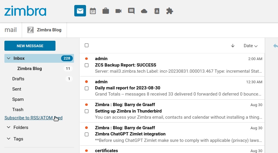 La fuente RSS/ATOM aparece como una carpeta en Zimbra: