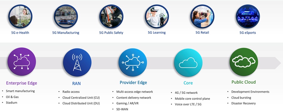 Claro, que la diversidad y complejidad de estas soluciones requerirán que sus componentes ejecuten en distintos entornos; en distintas “nubes”: el Edge de la Empresa Cliente, la RAN (Radio Access Network), el Edge de la Telco, la Core Telco Cloud o incluso en Nubes Públicas.