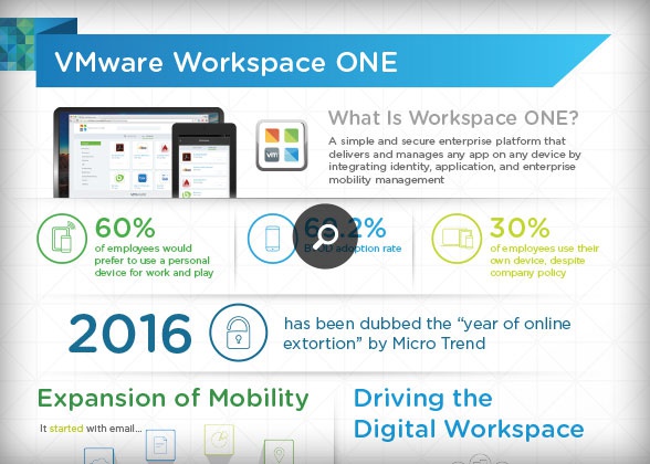 VMware Workspace ONE™ está diseñada para ofrecer un espacio de trabajo digital que integra las tecnologías de gestión de dispositivos, la entrega de aplicaciones y la gestión de identidad. Estos beneficios combinados en una única plataforma móvil permitirán una gestión segura y la entrega de los recursos críticos de negocio a los empleados de TI de la empresa, y un acceso sencillo para los usuarios finales. Esta solución ofrecerá opciones para todo tipo de usuarios, desde aquellos que trabajan con BYOD hasta dispositivos totalmente administrados por la empresa.