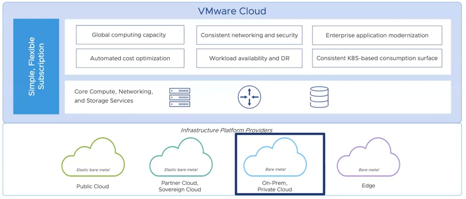 De esta manera, los usuarios de VMware tienen ahora la posibilidad de contar con una única plataforma, on premises y en la nube, capaz de ejecutar máquinas virtuales y clusters Kubernetes, administrando esa infraestructura híbrida desde una única consola y aprovechando un modelo de licenciamiento basado en suscripción tanto para su plataforma en la nube como para su plataforma on-premises.
