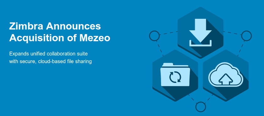 Zimbra, podemos leer que Zimbra comunica la adquisicion Mezeo. Siendo esta una compañía de software que proporciona sincronización de archivos de forma segura para compartir el almacenamiento en la nube para proveedores de servicios, gobiernos y empresas en todo el mundo en general.