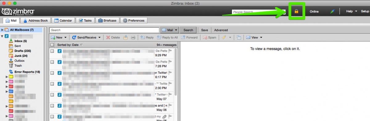 Una vez activado, podremos ver un nuevo icono de candado en la barra superior. De esta manera se podrá hacer clic en el icono o simplemente cerrar Zimbra Desktop, la cual solicitara la contraseña de la cuenta principal Zimbra Desktop.