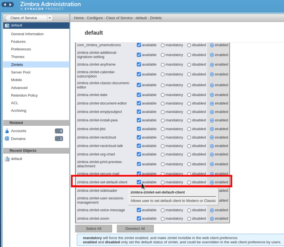 En la Consola de administración puede encontrar su Clase de servicio a través del menú Configurar->Clase de servicio. Compruebe si el Zimlet zimbra-zimlet-set-default-client está habilitado y disponible en su CoS en la sección Zimlets.