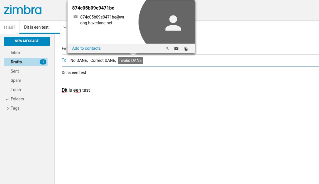 Ahora dirígete a https://havedane.net/ . Aquí ves un montón de direcciones de correo electrónico de aspecto extraño. Para hacer una prueba de DANE, cópielos en un nuevo correo electrónico y observe cómo el resultado de la página se vuelve verde. También ejecútelo tail -f /var/log/mail.logen su Zimbra para ver los registros de Postfix. Si ve una pancarta roja en havedane.net, la prueba falló. Busque pistas en los registros.