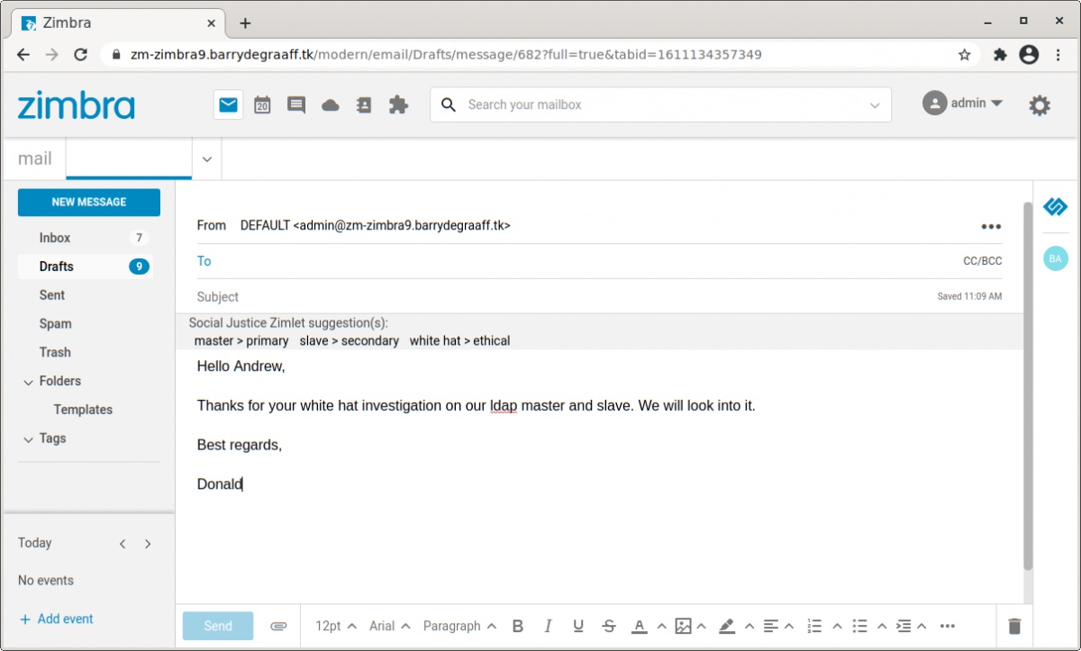 El nuevo zimlet de hoy de Barry de Graaff, evangelista del canal de Zimbra Synacor, es el zimlet de justicia social. Mientras escribe un correo electrónico, este zimlet sugiere palabras alternativas cuando sea apropiado. Por ejemplo: master ldap> primary ldap.